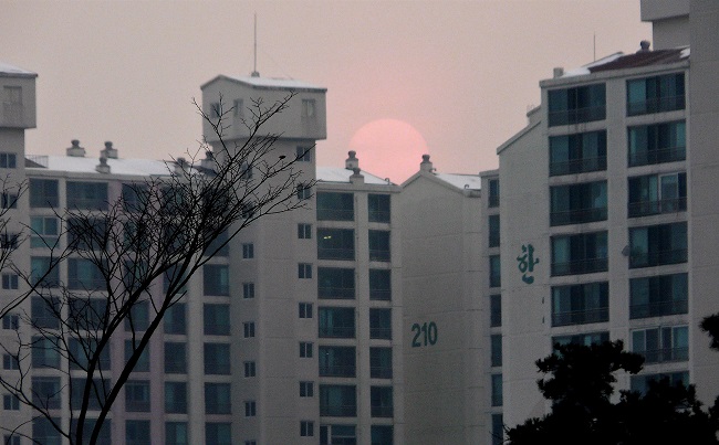 Crépuscule sur une banlieue sud de Séoul. Tous les immeubles sont estampillés d'un numéro géant et la plupart affichent le logo des grands conglomérats coréens ou chinois